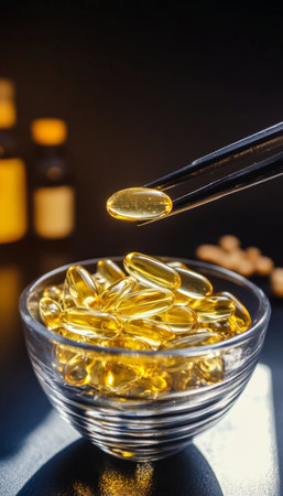 An omega 3 capsule with floating golden gel capsules in soft warm light, symbolizing health and wellness benefits