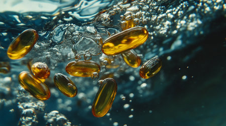 Cod liver oil omega 3 gel capsules floating in water with bubbles.