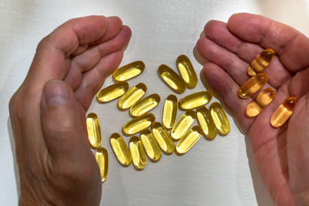 Fish oil capsules in hand. Biologically active prey. Vitamins and dietary supplements.