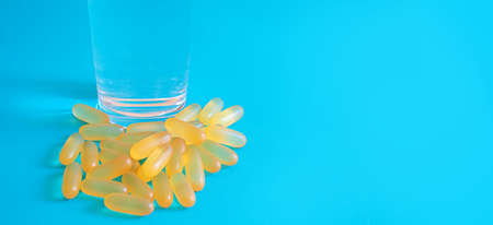 Yellow vitamins tablets, fish oil, Omega Vitamin E. Pills on a blue background. Web banner. Beautiful background. Copy space.