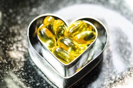 Heart-shape plate with fish oil capsules omega 3, healthy product and supplement concept close up, flat lay