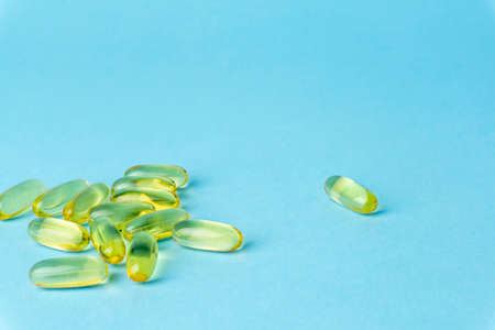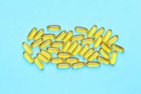Fish oil fish fat capsules. Omega 3 vitamins in yellow gelatin capsules on a blue background