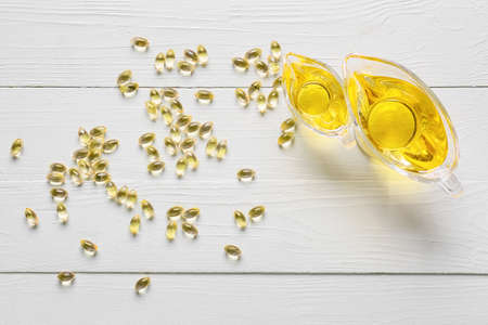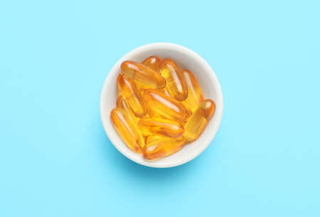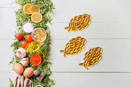 Fish oil capsules with omega 3 and vitamin D in healthy diet concept