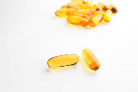 yellow transparent capsules omega 3 lie on a white background. healthy food concept