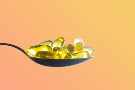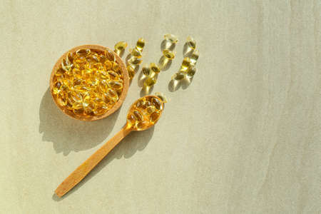 Spoonful of gel capsules of omega 3. Close up capsules fish oil in wooden spoon