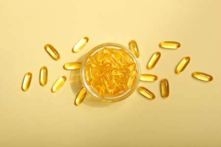 Vitamin D supplement capsules - science based nutrition. close up with vitamin D oil capsules with copy space on a yellow background