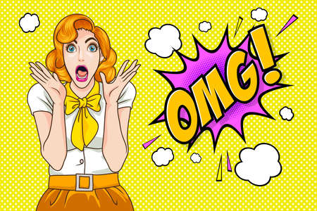 surprised woman face wow with open mouth omg Pop art retro comic