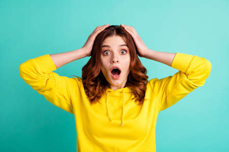 Photo of charming cute scared frightened girlfriend holding her head with hands staring with eyes open wide expressing negative emotions isolated over turquoise color vibrant background