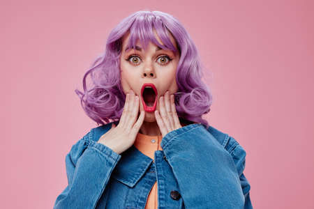Positive young woman wavy purple hair blue jacket emotions fun studio model unaltered very peri