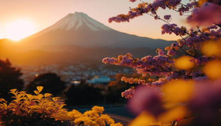 Snow-capped peak rises majestically as cherry blossom trees frame the foreground in a tranquil landscape at dawn near.