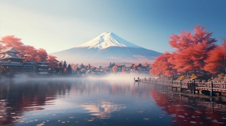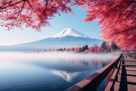 ai generated, fuji, fujisan, japan, autumn, fall, tokyo, scenery, japanese, asia, maple, mountain, lake, landscape, nature, red, beautiful, travel, background, tree, season, reflection, tourism, beauty, sky, water, asian, blue, scenic, mt, landmark, winter, light, fujiyama, momiji, mount, day, kawaguchi, yamanashi, outdoor, attraction, foliage, leaf, blossom, volcano, mount fuji, kawaguchiko, cherry, fog, colorful
