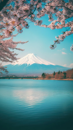 The image captures a scenic vista of a snow-capped mountain reflecting in a tranquil lake. Pink cherry blossoms frame the composition, creating a soft, romantic atmosphere. The scene features delicate textures, with pastel hues and natural lighting, suitable for travel or decorative purposes. The serene environment could be used for editorial or commercial applications.