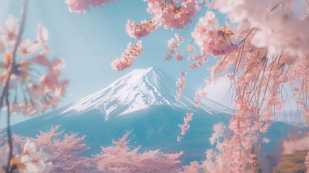 A majestic snow-capped Mount Fuji stands tall in the distance, framed by a vibrant display of delicate pink cherry blossoms. The gentle breeze carries petals through the air, creating a dreamy, ethereal scene.