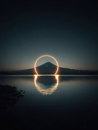 Captivating view of Mount Fuji illuminated by a radiant sun halo, reflecting perfectly on the still waters below at dusk. A serene nature scene.