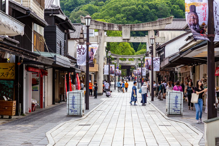Dazaifu, Japan - 10 July 2019 - Tourists and local japanese people walk along the main road, surrounded by shops, leading to the famous Tenmangu Shrine in Dazaifu, Japan on July 10, 2019