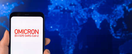 Omicron variant of coronavirus. Mobile phone with omicron text against earth planet global map background. SARS-CoV-2, B.1.1.529. World epidemic concept