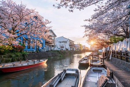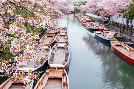 Sakura cherry blossom and punting boats along river at Yanagawa at sunset, Fukuoka, Kyushu, Japan. Famous travel destination to cruising and sightseeing along river.