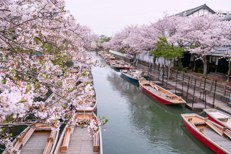 cherry sakura blossom and punting tourist boat at dock along Suigo river at Yanagawa Kanko Kaihatsu, Fukuoka, Japan. Famous travel to cruising and sightseeing town.