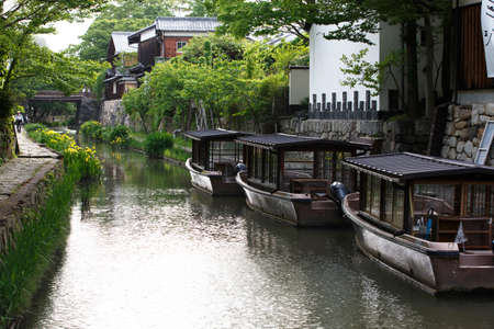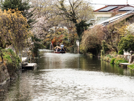 Calm river with Japanese houseboat in Fushimi, Kyoto