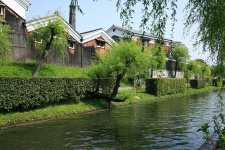 Okayama, Japan - April 15, 2019 : Kurashiki Bikan Historical Quarter, canal and traditional house
