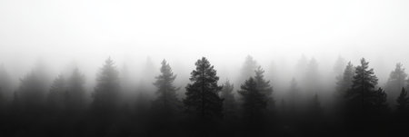 A beautifully tranquil forest scene featuring the silhouettes of tall pine trees that are enveloped in a blanket of thick fog, creating a serene, peaceful, and emotionally touching atmosphere for all