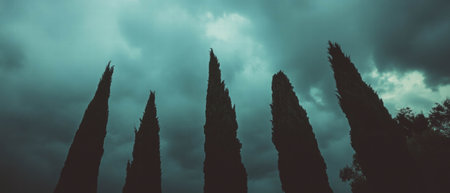Cypress trees rise dramatically against a dark and moody sky at dusk