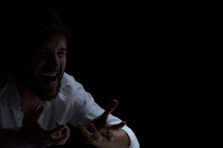 Dark interior with schizophrenic man with laugh attack