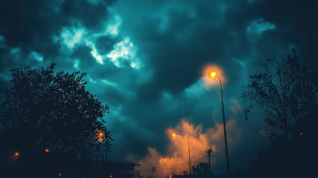 A captivating nighttime scene featuring a street lamp casting a warm glow against a backdrop of dramatic, swirling clouds.