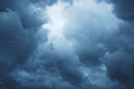 Dramatic cloudscape. Sunny light through dark heavy thunderstorm clouds before rain. Overcast rainy bad weather. Storm warning. Natural blue background of cumulonimbus. Sunlight in stormy cloudy sky.