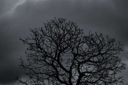 Silhouette dead tree and branch on grey sky background. Black branches of tree. Nature texture background. Art background for sad, dead, lonely, hopeless, and despair. Halloween day background.