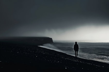 A person standing on a beach next to the ocean, A lone figure silhouetted against a black horizon