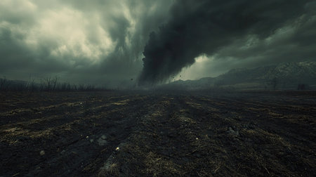 A powerful tornado forms in the distance, shrouded by dark clouds, creating an ominous atmosphere over a rural landscape, illustrating nature's unpredictable fury.