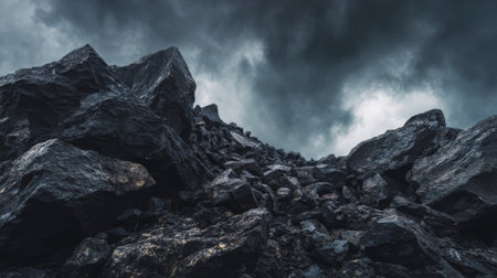Captivating rocky landscape captured under ominous dark clouds, portraying the raw beauty of nature. The rocky ascent creates a dramatic scene that evokes feelings of adventure and timelessness.