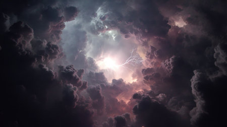 A breathtaking capture of a dark stormy sky filled with swirling clouds and a brilliant lightning bolt illuminating the atmosphere. The scene conveys the raw power and beauty of nature, creating a dramatic and intense visual impact perfect for backgrounds and thematic projects.