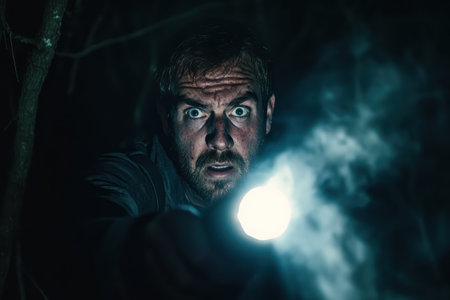 Dramatic portrait of scared man in foggy forest holding flashlight, expressing fear and suspense in a cinematic horror-like scene.