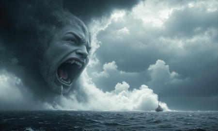 A storm cloud forms a furious face, screaming at the sky while powerful winds spiral into a massive cyclone, hurtling