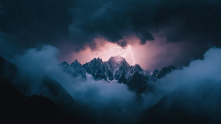 Lightning striking the top of a mountain, thunderstorm in the sky