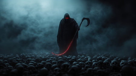 A dark, atmospheric scene featuring a cloaked figure with glowing red eyes and a scythe. The figure stands amidst a vast expanse of skulls, creating a sense of foreboding and mystery.