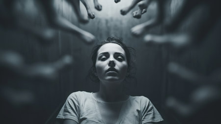 A woman is surrounded by hands in a dark room, AI