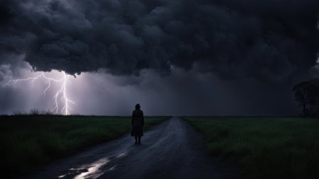 Dark Stormy Road with Heavy Rain and Ominous Clouds in a Moody Landscape. High quality photo