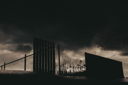Dark dramatic silhouette of a fence and metal mesh against a stormy sky. Moody atmospheric scene with strong contrast, ideal for themes of tension, mystery, security, or cinematic storytelling.