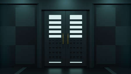 3D render of an open door in a dark room with glowing lights
