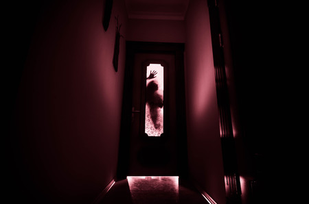 Silhouette of an unknown shadow figure with hands on a door through a closed glass door. Horror concept