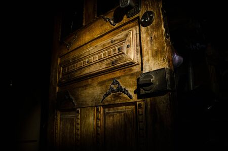 Close up view of old antique wooden door inside a dark room. Selective focus. Horror concept