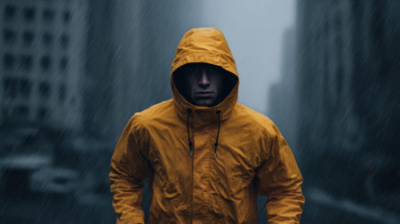 A solitary figure dressed in a bright yellow rain jacket walks through a rainy urban street. The moody backdrop captures a sense of isolation and reflection.