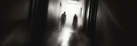 Shadowy figures linger in a dark corridor, illuminated by eerie flickering light, evoking a sense of dread and suspense in the air.