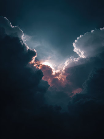 Dark clouds gather as sunlight breaks through, creating a stunning display of color and contrast at twilight, highlighting natures beauty.
