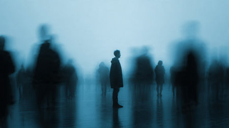 A lone person stands out in a crowded and foggy urban environment