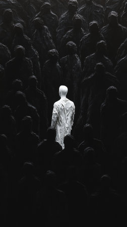 solitary white figure in crowd of dark figures, artistic concept