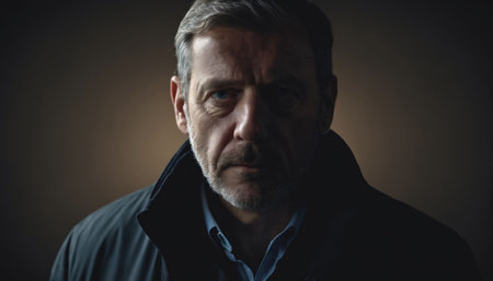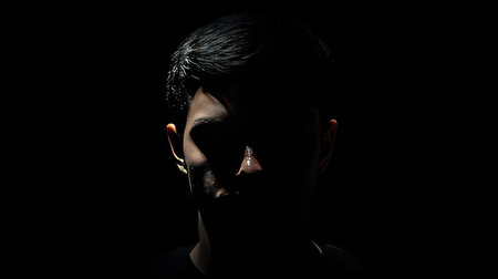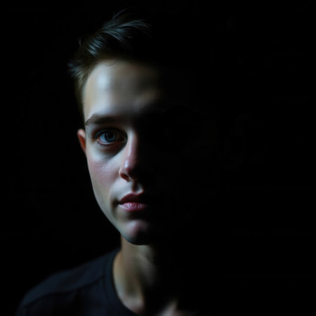 A man's face partially illuminated in shadow, creating a mysterious and intriguing portrait with dramatic lighting.